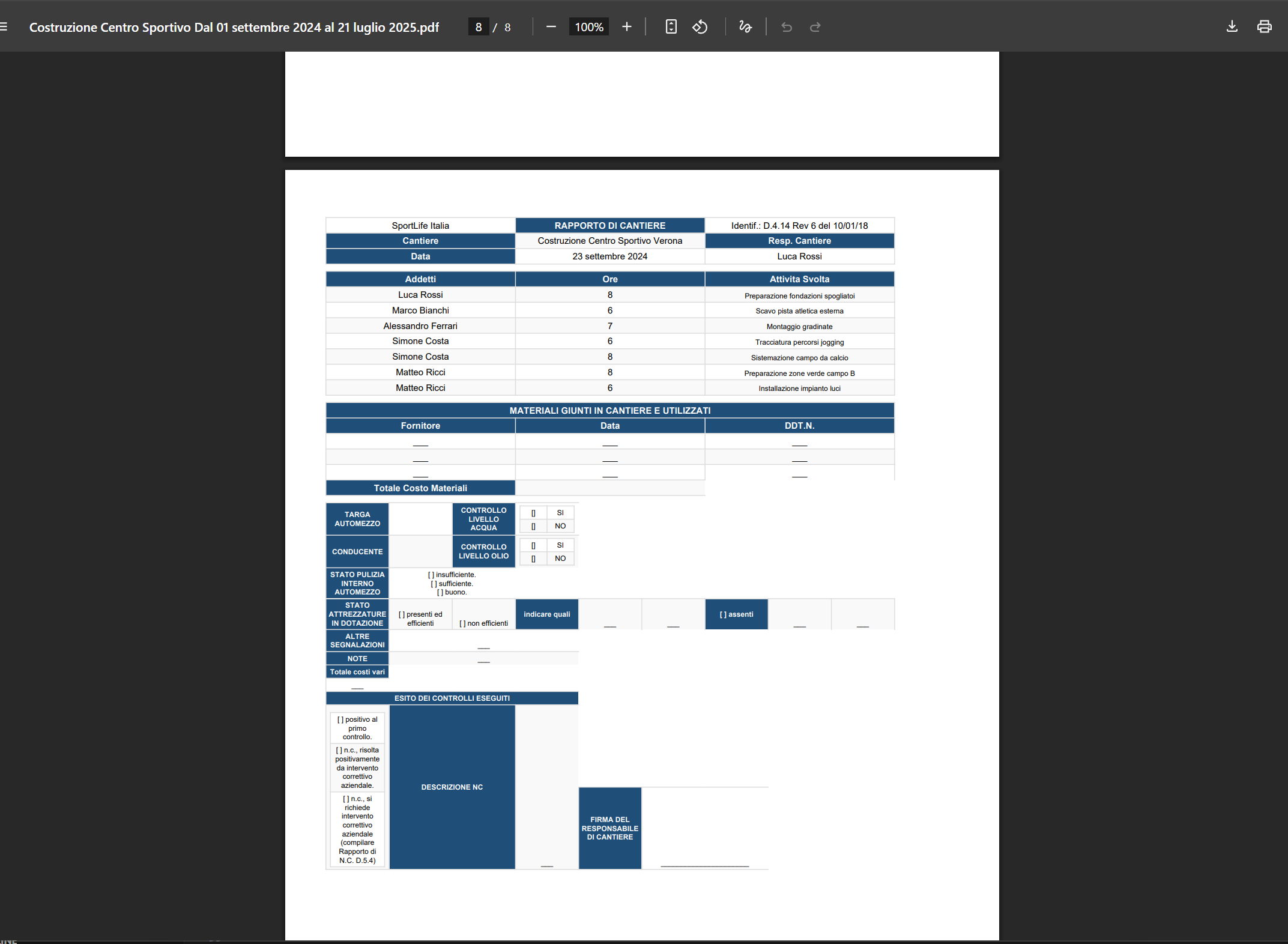 E' possibile generare il file PDF automaticamente selezionando un cantiere o una data. Il PDF generato è conforme alla normativa ISO e sarà compilato con i dati dei rapportini compilati dagli operai. Basterà stamparlo per avere la giusta documentazione pronta per il controllo qualità.
