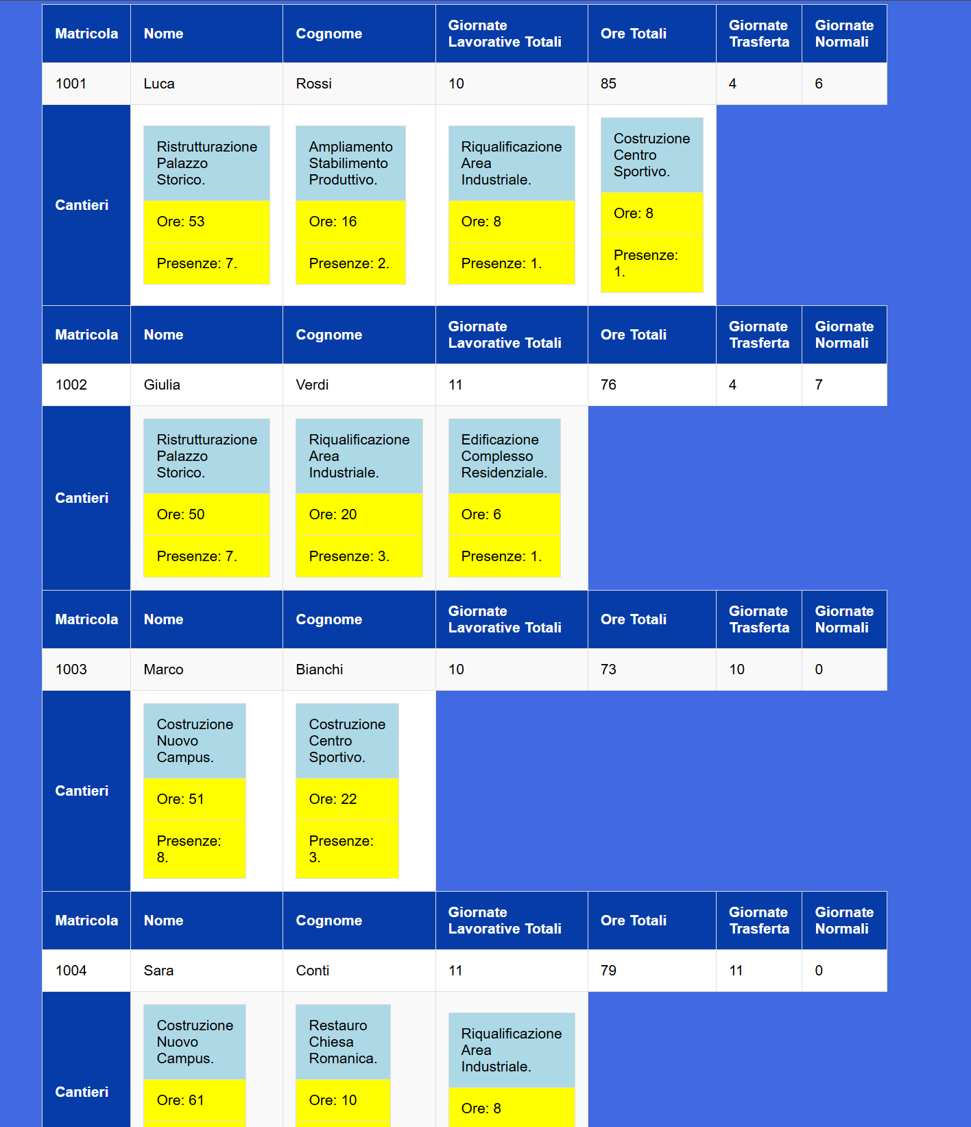 E' possibile visualizzare tutti i dati lavorativi di ogni dipendente, comprese le ore, i giorni e i cantieri in cui ha lavorato, in un range di date selezionate. Cio' faciliterà la gestione e la realizzazione delle buste paga.