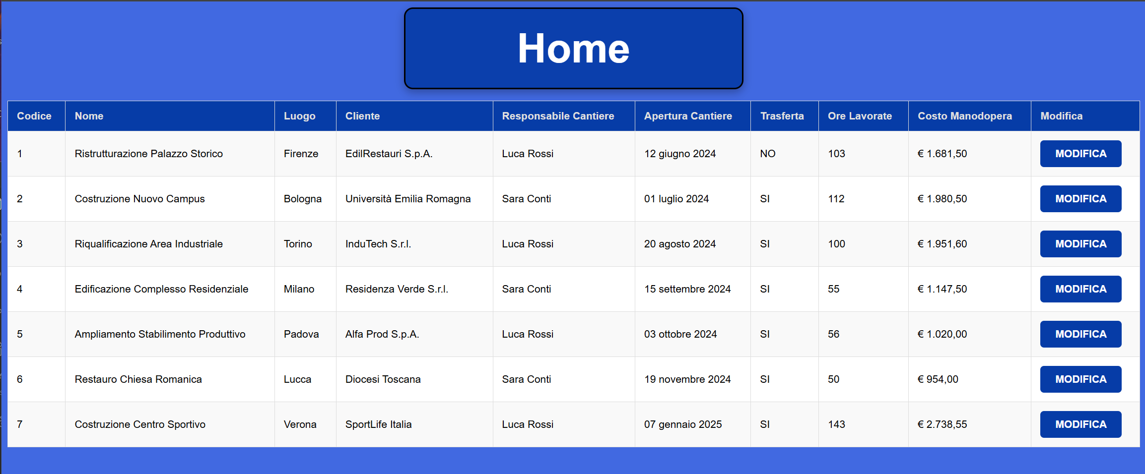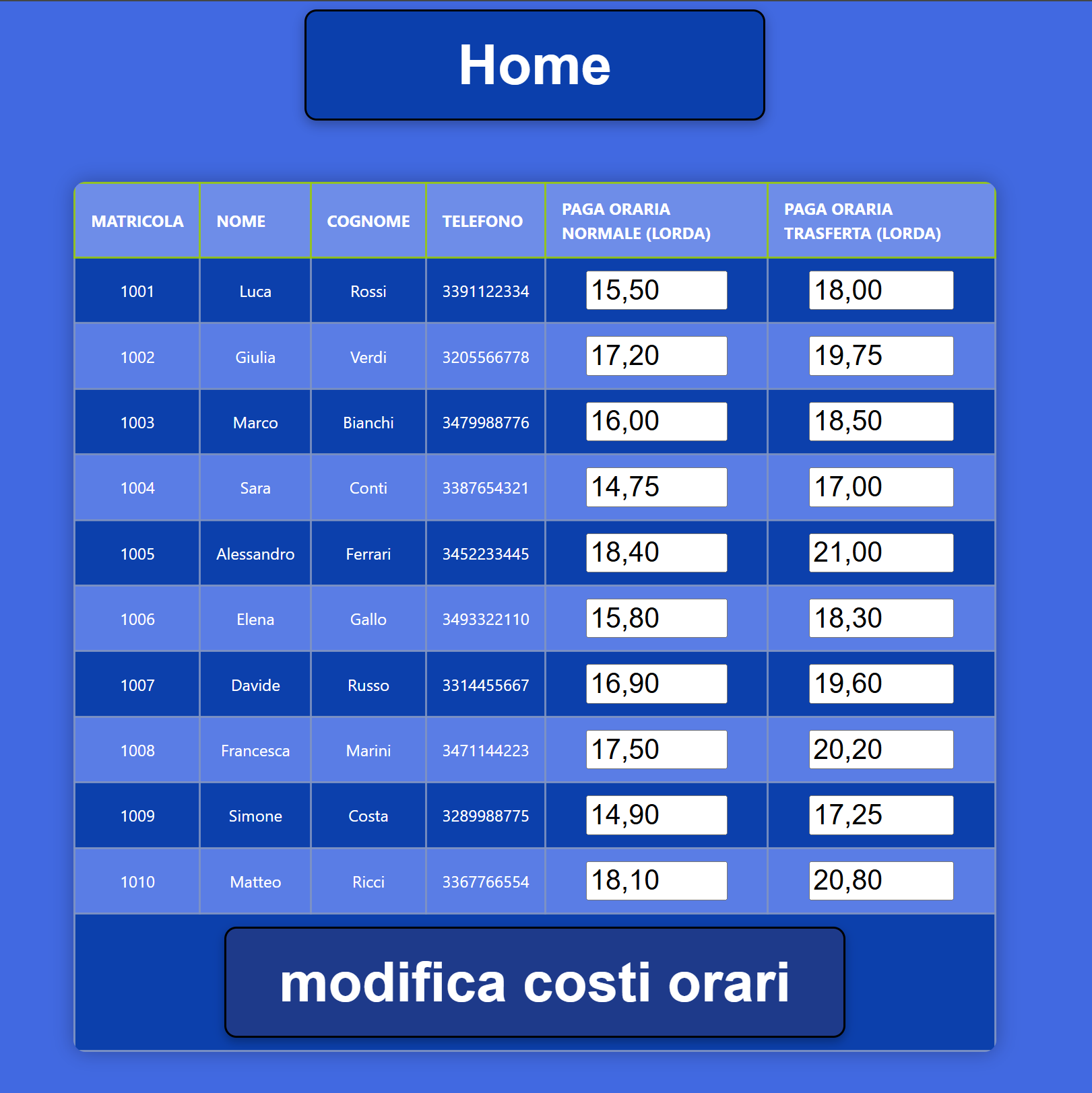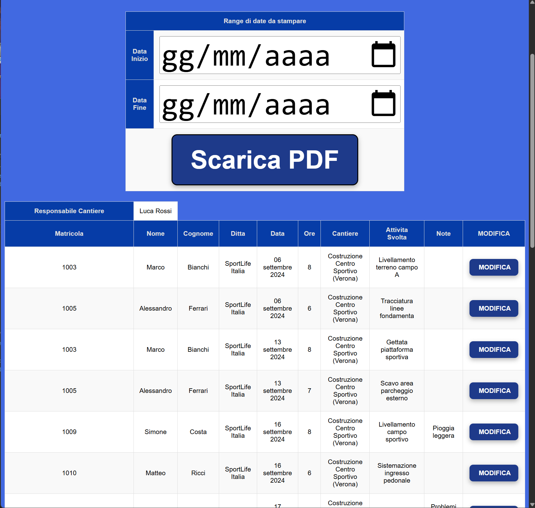 E' possibile visualizzare tutti i dati lavorativi di ogni dipendente, comprese le ore, i giorni e i cantieri in cui ha lavorato, in un range di date selezionate. Cio' faciliterà la gestione e la realizzazione delle buste paga.